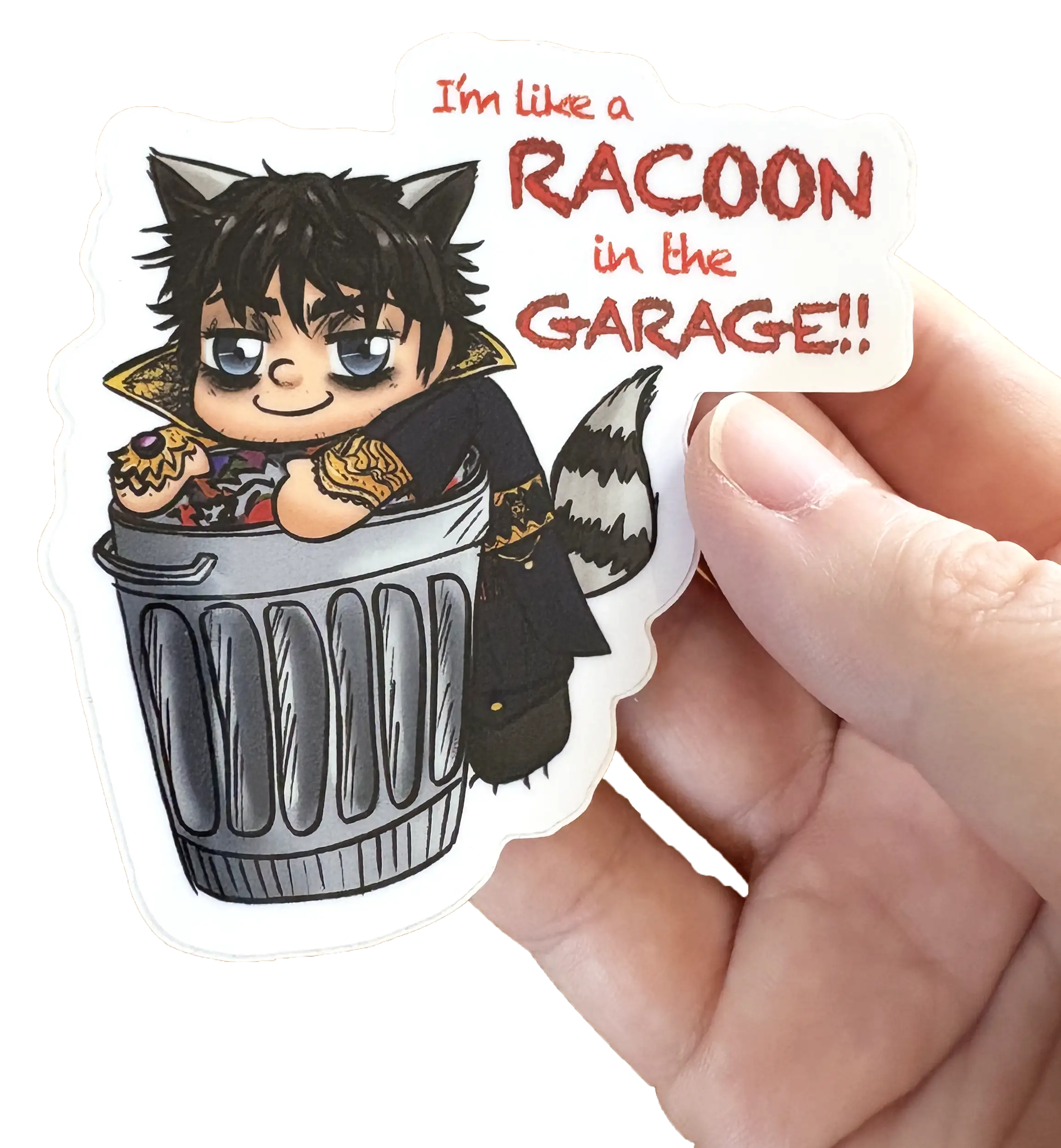 This vinyl sticker is approximately 7cm. It features Enver Gortash with the words “I’m like a raccoon in the garage!” from Baldur’s Gate 3.