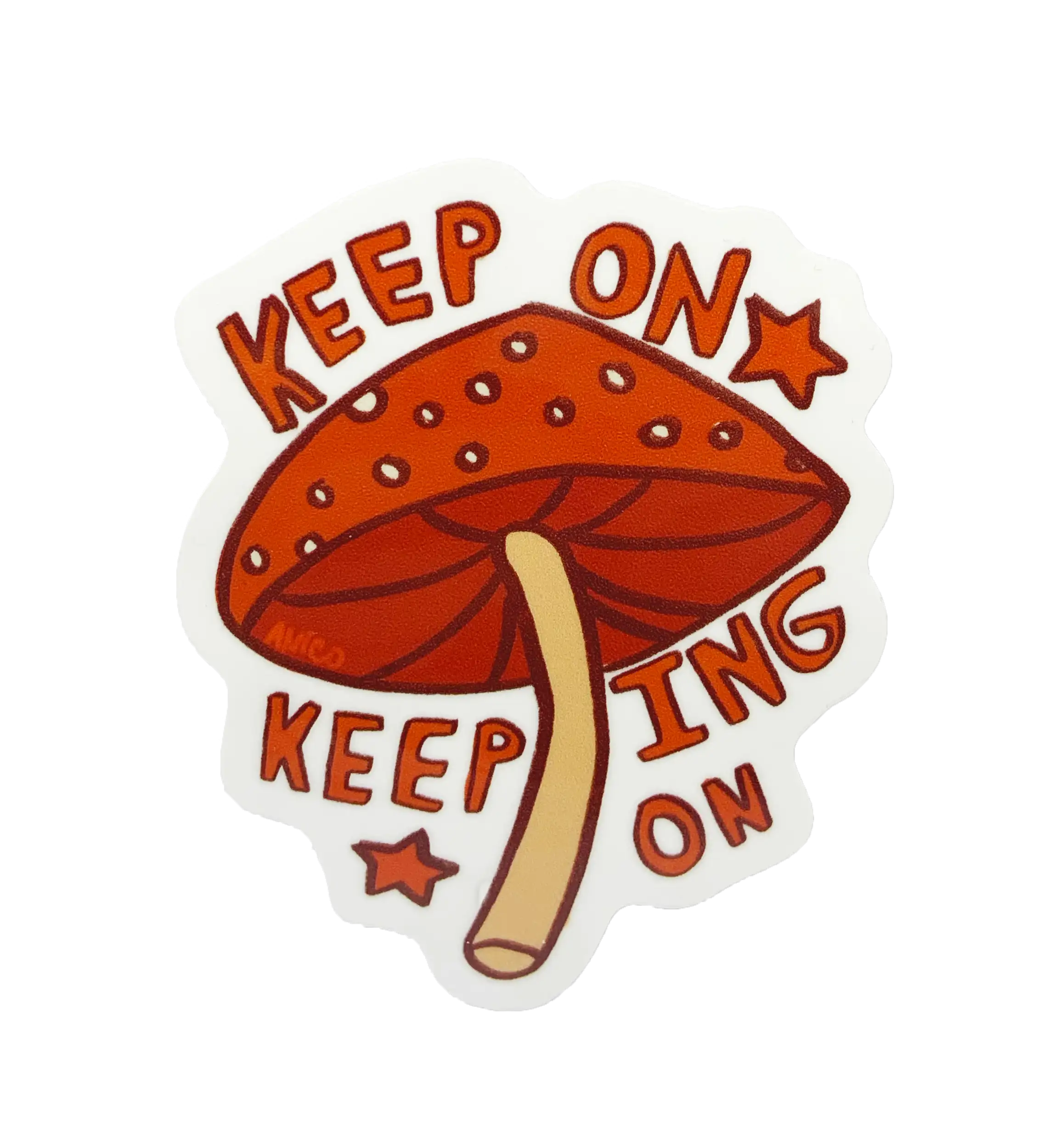 This vinyl sticker is approximately 7 cm tall. It features a orange mushroom with the words “Keep on keeping on.”